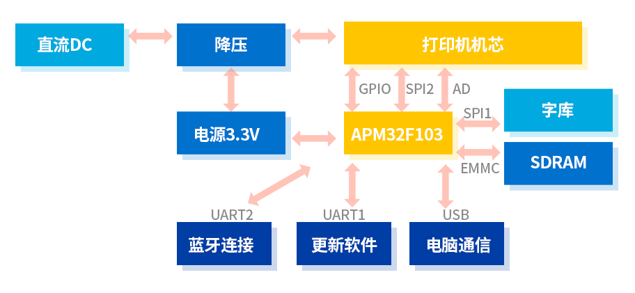 ·APM32F103采用ARM® Cortex®-M3内核,工作频率最高96MHz, Flash高达512Kbytes,SRAM高达128Kbytes,支持FPU浮点运算功能,可提供更高系统处理能力,满足票据打印机对更高信号处理速度与精度要求。