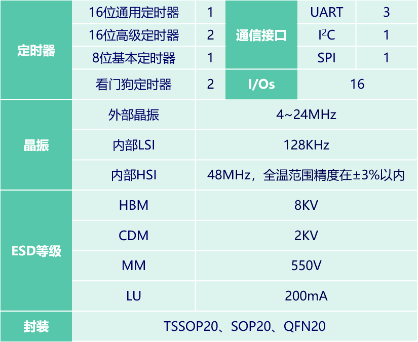 ·集成16-bit通用定时器、16-bit高级定时器以及8-bit基础定时器等外设资源,可全面提升产品的多样化控制和连接,满足传感器的多样化应用需求,比如超声波、雾化、磁旋转、温湿度、UV等模块功能。