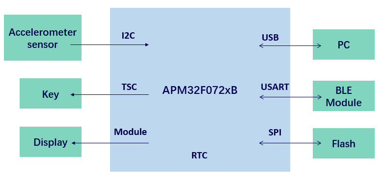▪The embedded full-speed USB 2.0 interface enables remote firmware upgrades, and HSI provides a clock without an external crystal, ensuring stable communication of smart pedometer data while reducing the overall BOM cost. Cost-sensitive customers can opt for trim versions like APM32F071xB and APM32F070xB.