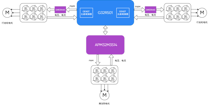 APM32M3514 主要负责控制清洁滚刷电机,搭载Cortex-M0+内核,主频72MHz,集成M0CP硬件加速协处理器,通过极海自研的生态算法平台,可实现对滚刷转速与转矩的精准调节,既能保证强力去污,又能避免因转速不当损伤光伏面板镀膜。
