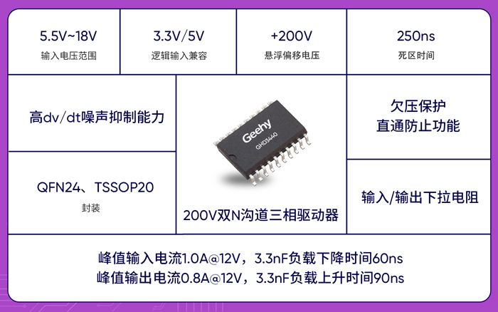 GHD3440 200V双N沟道三相驱动器,主要用于驱动行走电机和清洁滚刷电机的功率MOSFET,将MCU/SoC信号转换为驱动功率管的强劲电流,从而提升设备动力输出效率与运动稳定性。