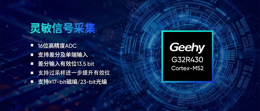 G32R430编码器专用MCU配备2个16位高精度ADC,支持规则序列、注入序列、单次及连续采样模式,通过主从模式可实现多通道同步采样;支持差分及单端输入,其中差分输入有效位13.5-bit(支持过采样可进一步提升有效位);并能精准支持≥17-bit的磁编码器与≥23-bit的光编码器,从信号源头保障数据的纯净性与准确性,从容应对各种严苛信号采集挑战。